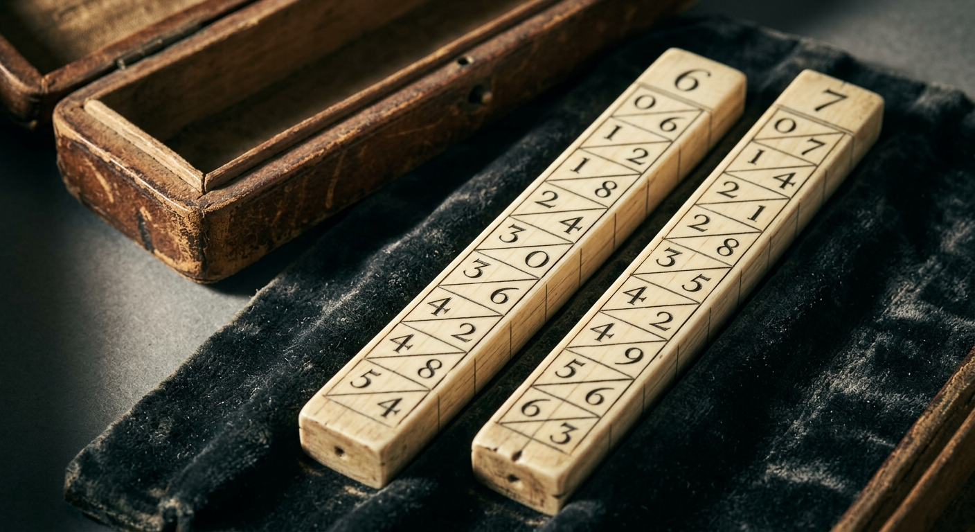 This device’s fate was the opposite of the rods’. The promptuary was complex to build — two hundred precisely inscribed strips, a custom box with storage compartments for each — and only one early physical specimen is known to survive, in a museum in Madrid. The rods were simple and proliferated across continents; the promptuary was elegant and vanished. Napier’s finest invention was too intricate for the world that needed it.